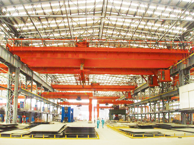 本起重機采用掛梁吊運長件鋼坯、板材、棒材、盤圓等物品,配置電磁吸盤或夾鉗或特殊群鉤進行吊裝,主要由箱形橋架、起重小車、大車運行機構、司機室和電氣控制系統組成,配有停電保磁系統。起升機構多采用單電機、雙減速器、雙卷筒布置,呈雙吊點形式。掛梁布置形式分垂直于主梁或平行于主梁兩種。其余形式與QD型起重機相同。